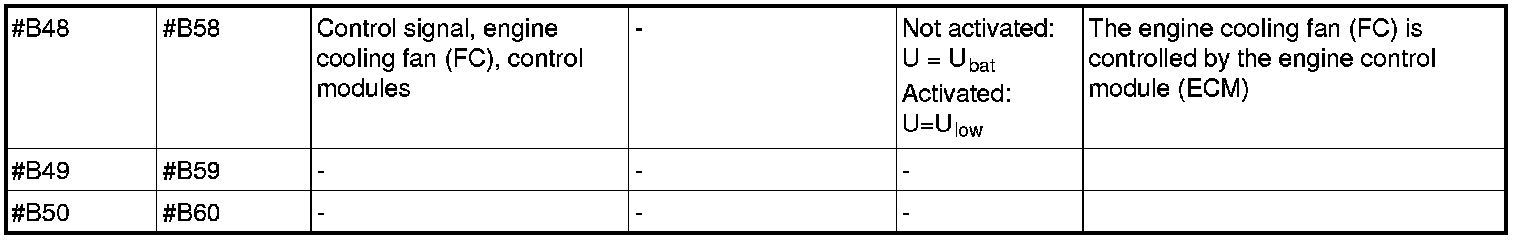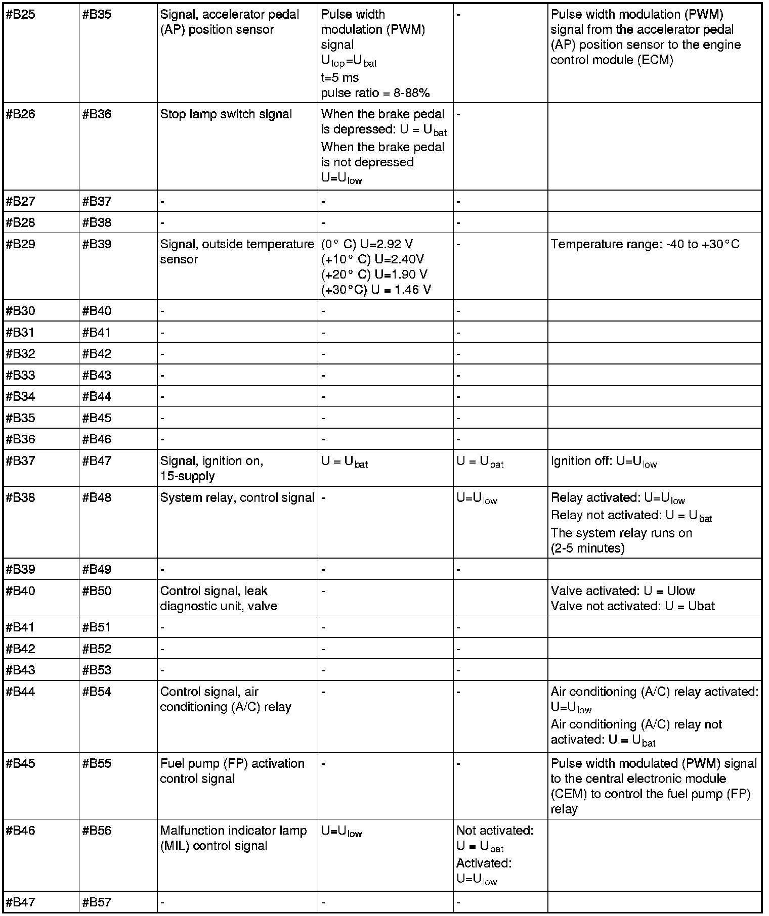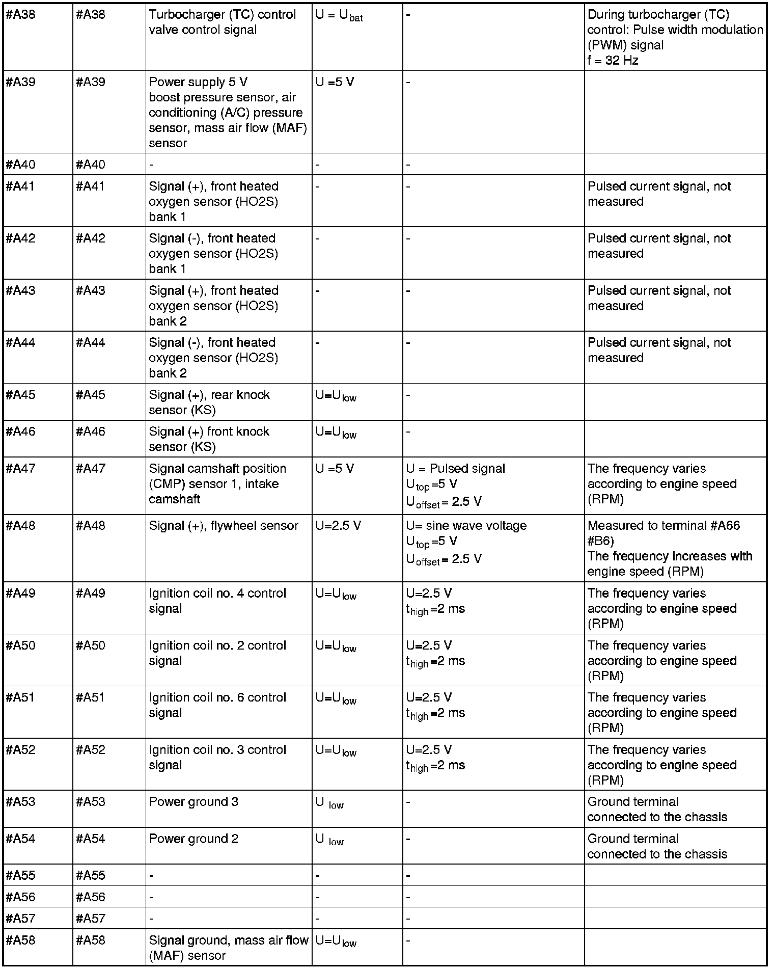 All values listed below should be measured between the respective terminal in column 1 (control module terminal) and terminal #B3 unless stated otherwise in column 6 (Other). Control module terminals #A1-#A70 correspond to terminals #A1-#B10 on the breakout box, terminals #B1-#B50 correspond to #B11 - #B60 on the breakout box.