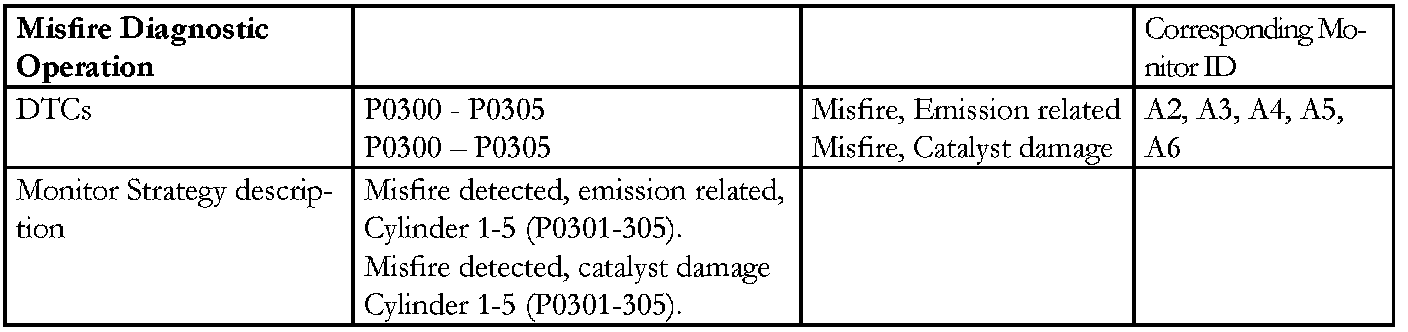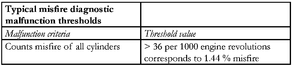 Misfire detection is enabled when the engine speed has reached 150 rpm below warm idle speed plus two crankshaft revolutions or after nine ignitions, depending on which occurs first. For detection of emission related misfires, the number of misfires which have occurred within the first interval of 1000 engine revolutions or the 4th exceedance (for the rest of DCY) over the emission threshold value after the first 1000 engine revolutions are relevant. If the number is so high that the exhaust emission standard is exceeded by a factor of 1.5, then the emission related misfire rate has been reached and exceeded a fault code will be stored. If misfires occur and the threshold is exceeded in the following DCY, MIL illuminates.