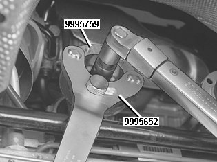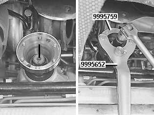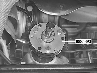 Remove the nut. Use counterhold 999 5652 Counterh 999 5652 Counterh. with adapter 999 5759 Adapter flange All-wheel drive 999 5759 Adapter Flange All-Wheel Drive.