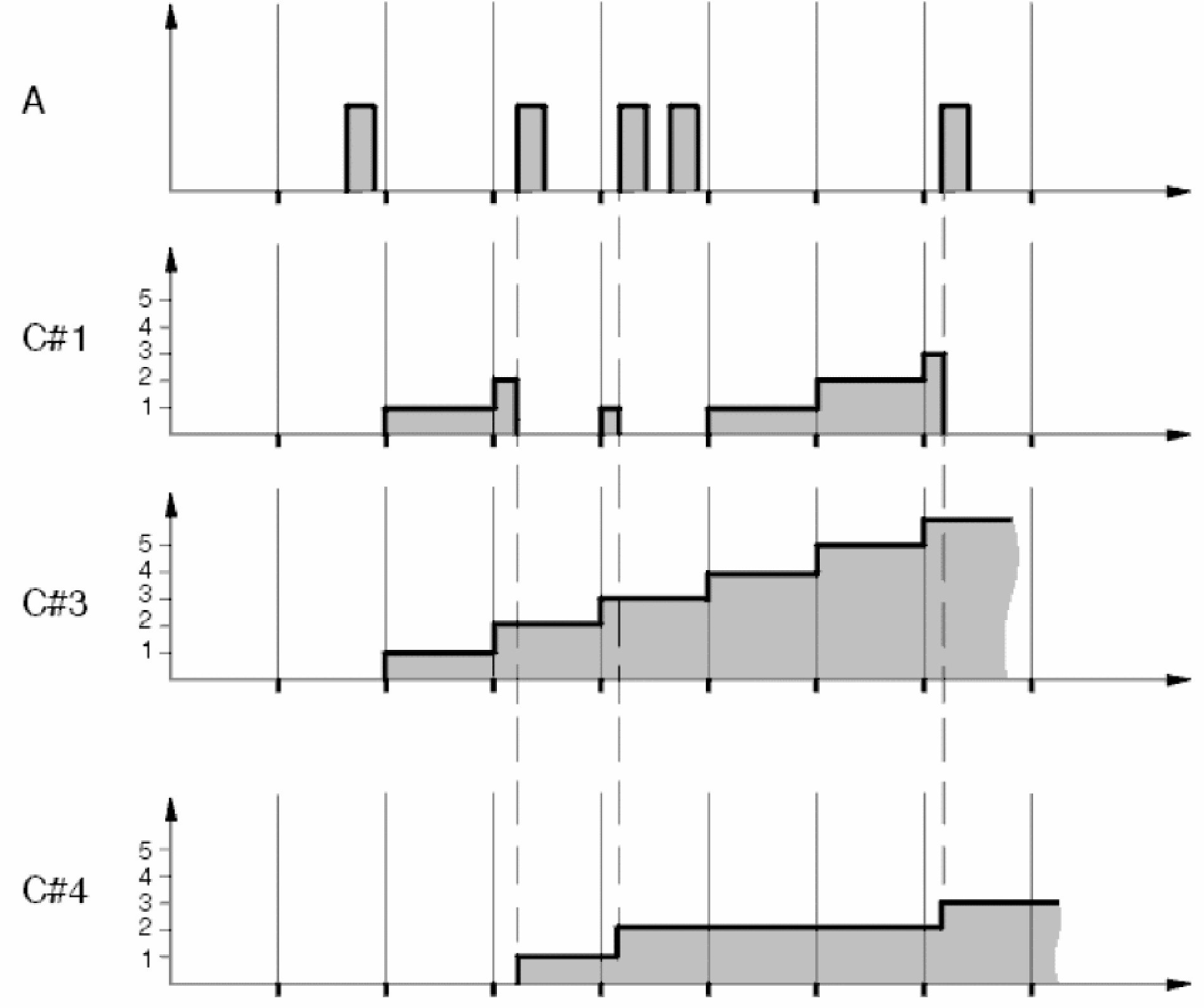 Counter 4 (C#4) (see graph). Counts the number of driving cycles in which the malfunction has been confirmed since it was confirmed the first time. The graph shows that after the malfunction was detected the first time, the malfunction has been detected in 3 driving cycles. Thus, after the malfunction was detected the first time, another 6 driving cycles (counter 3), have passed and in these the malfunction has been detected 3 times (counter 3). Simplified, one can say that in this example, the malfunction has occurred/been detected in every other driving cycle, and the malfunction can be assessed as relatively frequent.