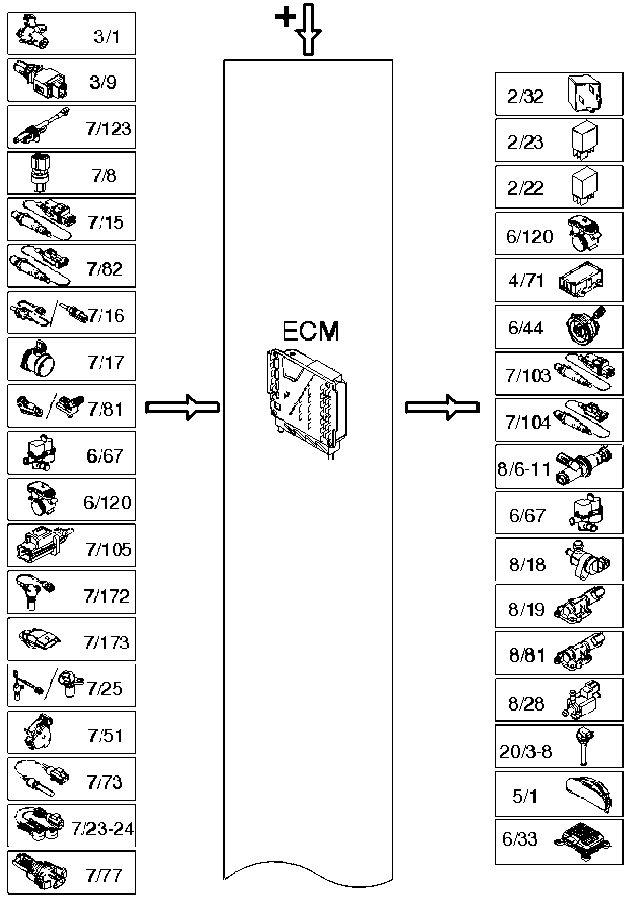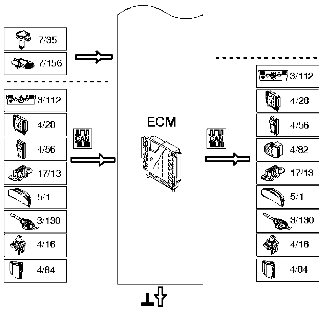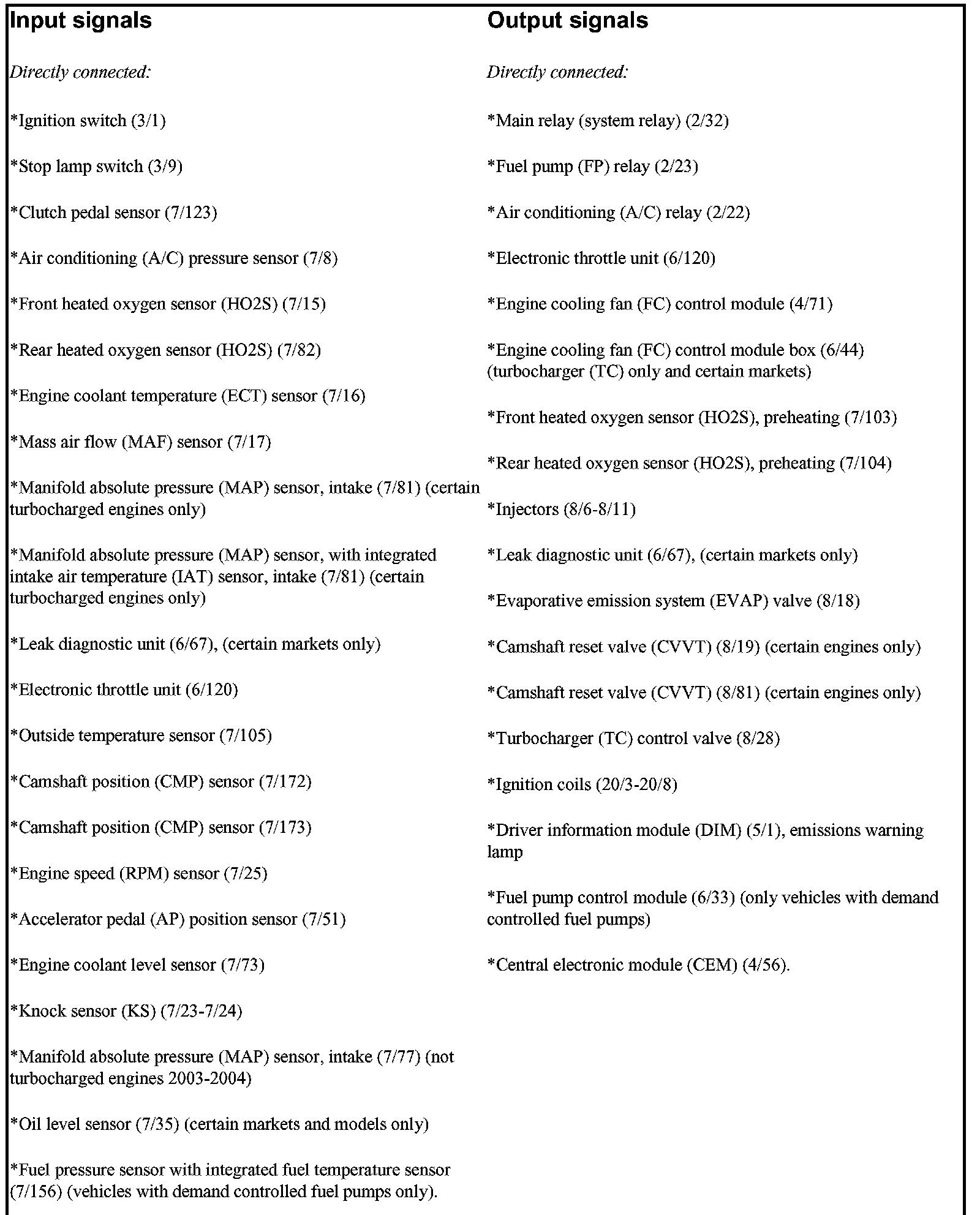 The table below summarizes the input signals to and output signals from the Engine Control Module (ECM). The signal types are divided into directly connected signals, serial communication and controller area network (CAN) communication. The illustration below displays the same information with the Volvo component designations.