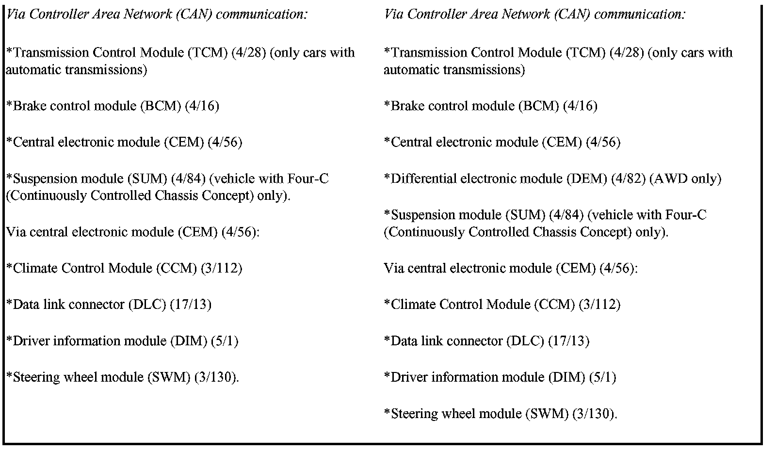 The engine control module (ECM) communicates with other control modules using controller area network (CAN) communication.