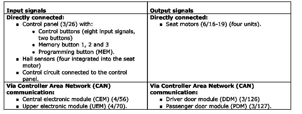 The table below summarizes input and output signals to and from the power seat module (PSM) (4/52). The signal types are divided into directly connected signals, serial communication and controller area network (CAN) communication. The illustration below displays the same information with the Volvo component designations.