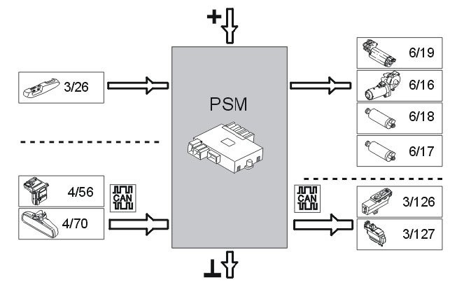 The power seat module (PSM) communicates with directly connected components and with other control modules via CAN communication.