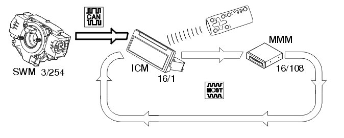 The steering wheel module (SWM) (3/254) transmits a signal to the infotainment control module (ICM) (16/1) via the controller area network (CAN).