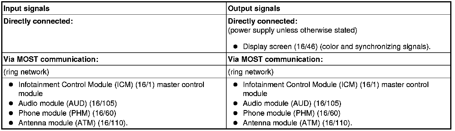 The table below summarizes the input signals to and output signals from the multimedia module (MMM). The signal types are divided into directly connected signals and MOST communication. The illustration below displays the same information with the Volvo component designations.