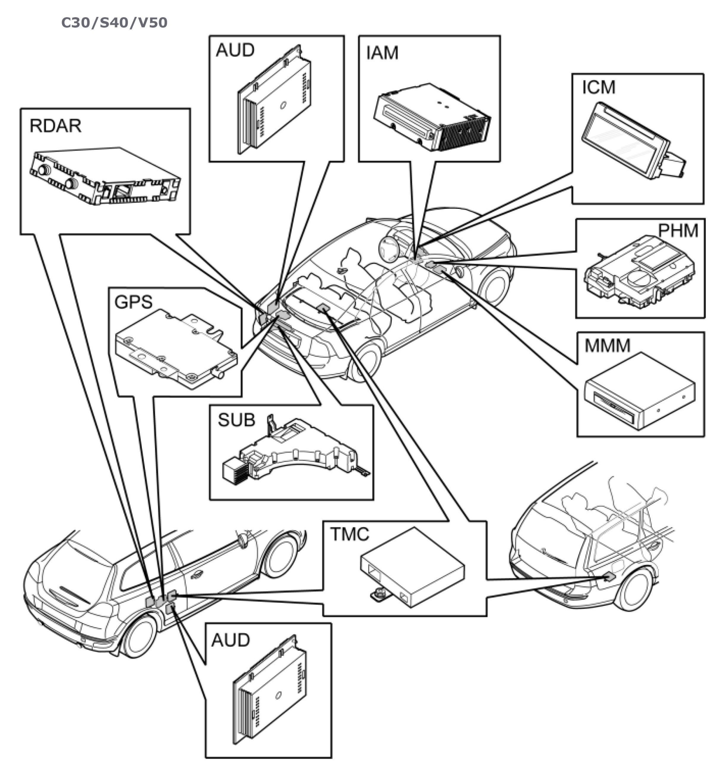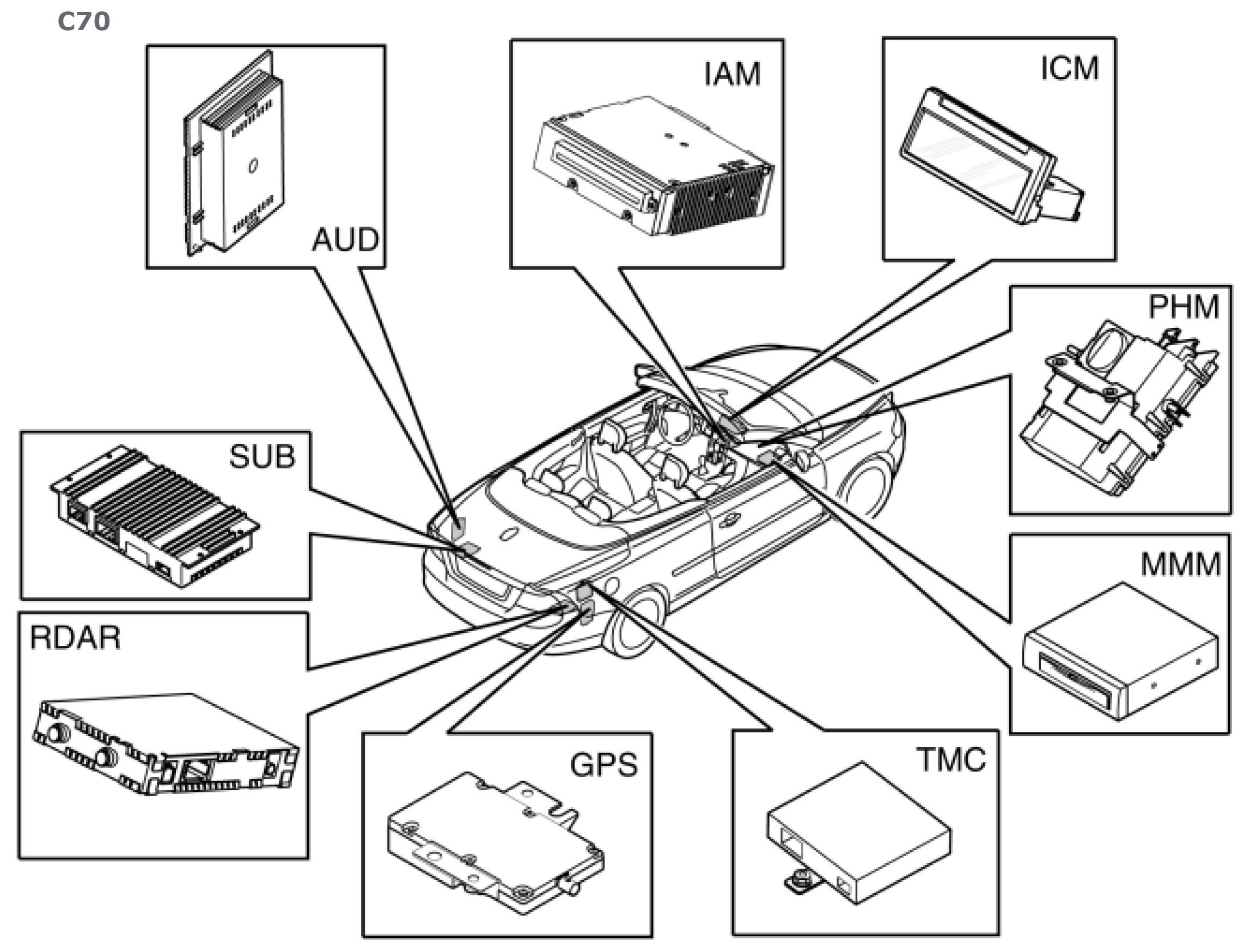 The infotainment control module (ICM) deals with monitoring and communication on the MOST network. The infotainment control module (ICM) is in turn monitored by the central electronic module (CEM) on the CAN network.