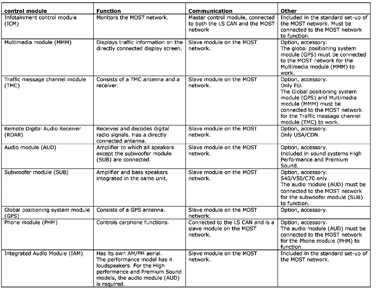 Master control module = Control module which monitors the MOST network. Slave control module = Control module which supplies the MOST network functions.