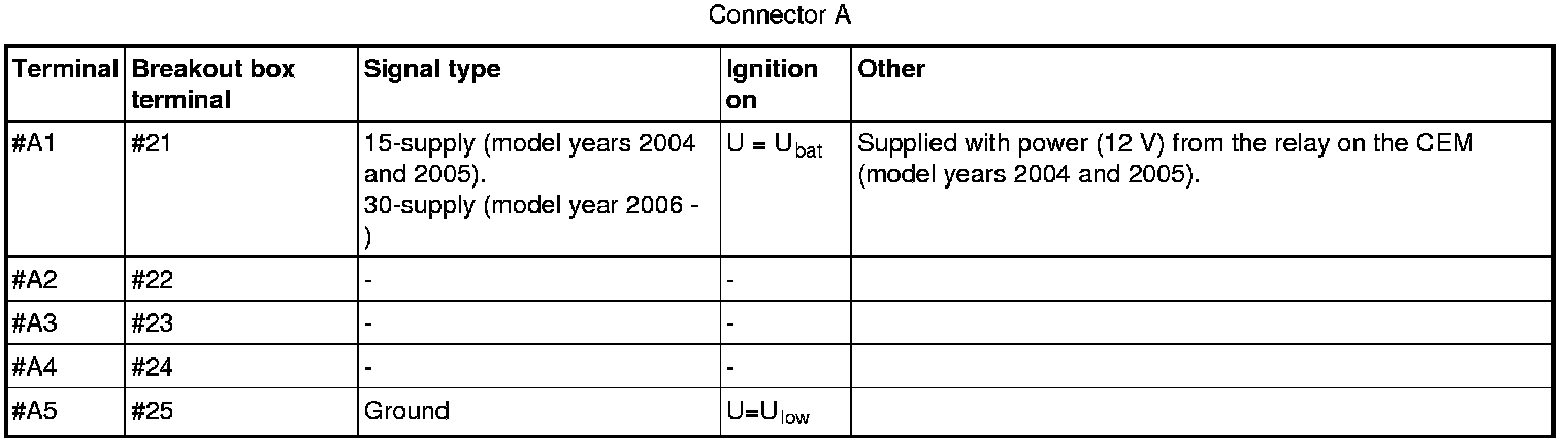 All the values given below are between the respective terminal in column 1 and terminal #A5 in column 2 (power ground) unless otherwise stated in brackets after the table entry.