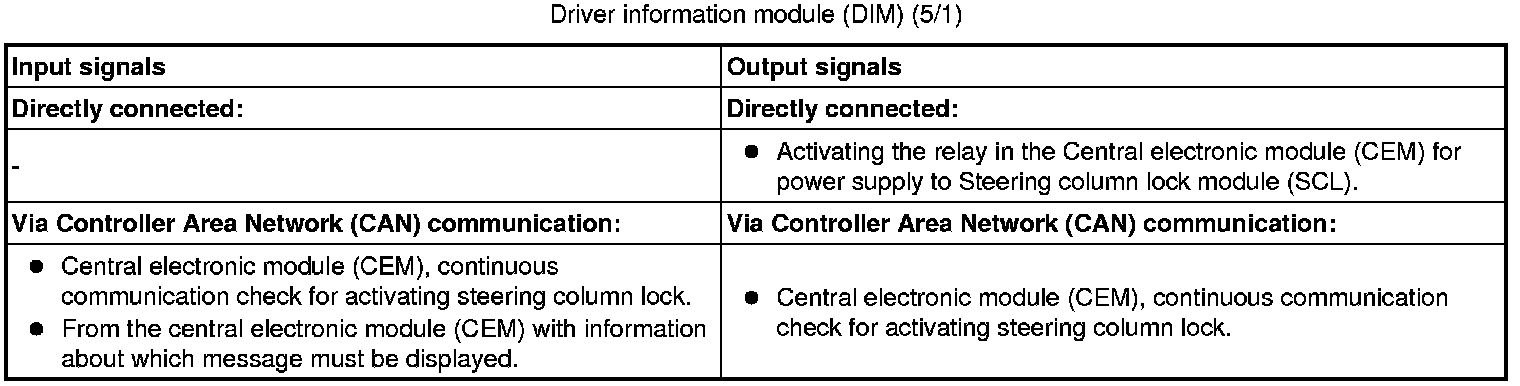 The tables below summarize the input and output signals to the units in the system for the immobilizer. The signal types are divided into directly connected signals, serial communication and controller area network (CAN) communication.