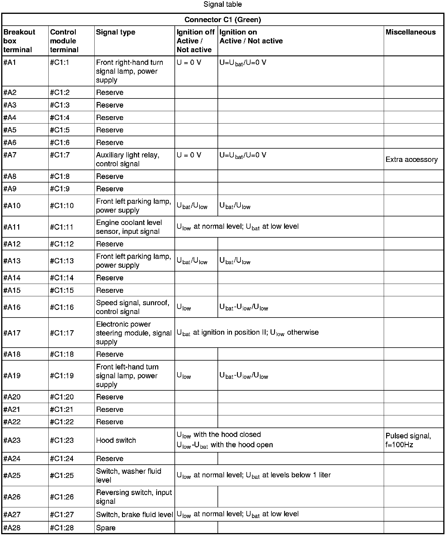 All values given below are between the terminals stated in column 1 and terminal #D5 (power ground). This applies unless otherwise indicated in the last column.