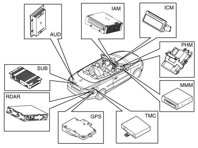 The infotainment control module (ICM) deals with monitoring and communication on the MOST network. The infotainment control module (ICM) is in turn monitored by the central electronic module (CEM) on the CAN network.