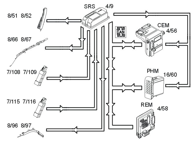 The control module also transmits a collision signal on a directly connected cable to the central electronic module (CEM) and the phone module (PHM) (16/60), so that these control modules can take certain actions.
