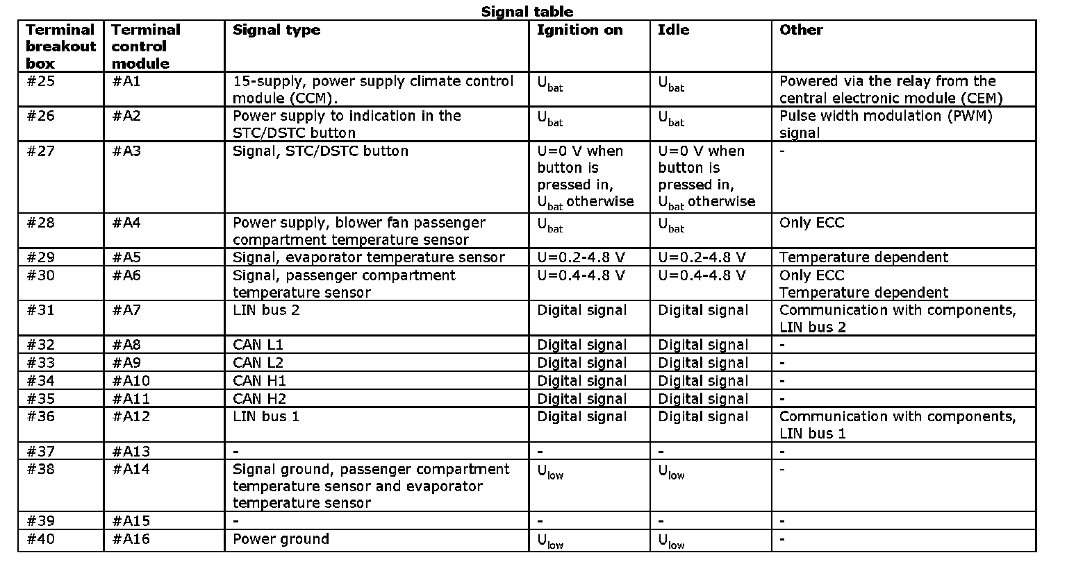 All the values given below are between the terminals stated in column 1 and terminal #A16 in column 2 (signal ground). This applies unless otherwise indicated in brackets.