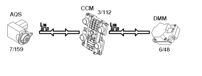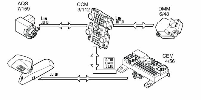 The air quality sensor (AQS) (7/159) transmits a signal to the climate control module (CCM) if it detects raised concentrations of pollutants in the outside air. When this occurs, the climate control module (CCM) transmits a signal to the damper motor for recirculation (6/48) to close the fresh air damper and to use recirculated air.