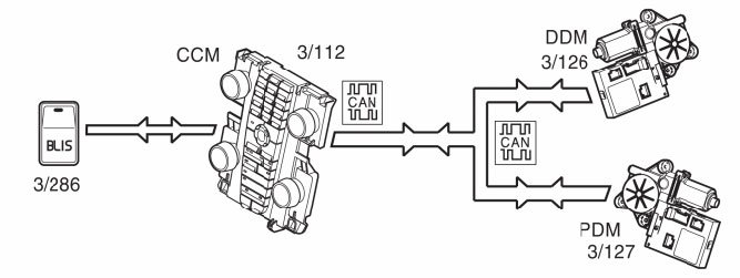 The Driver door module (DDM) / Passenger door module (PDM) then transmit a signal to the Climate control module (CCM) about whether the BLIS function is on or off.
