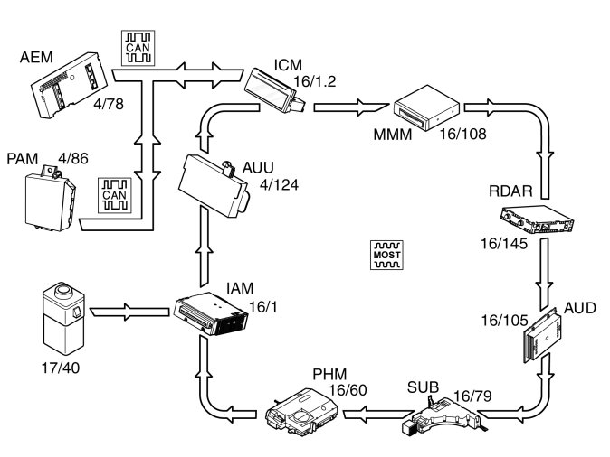 The integrated audio module (IAM) functions as a stereo system in the vehicle and is connected to other control modules on the MOST network.