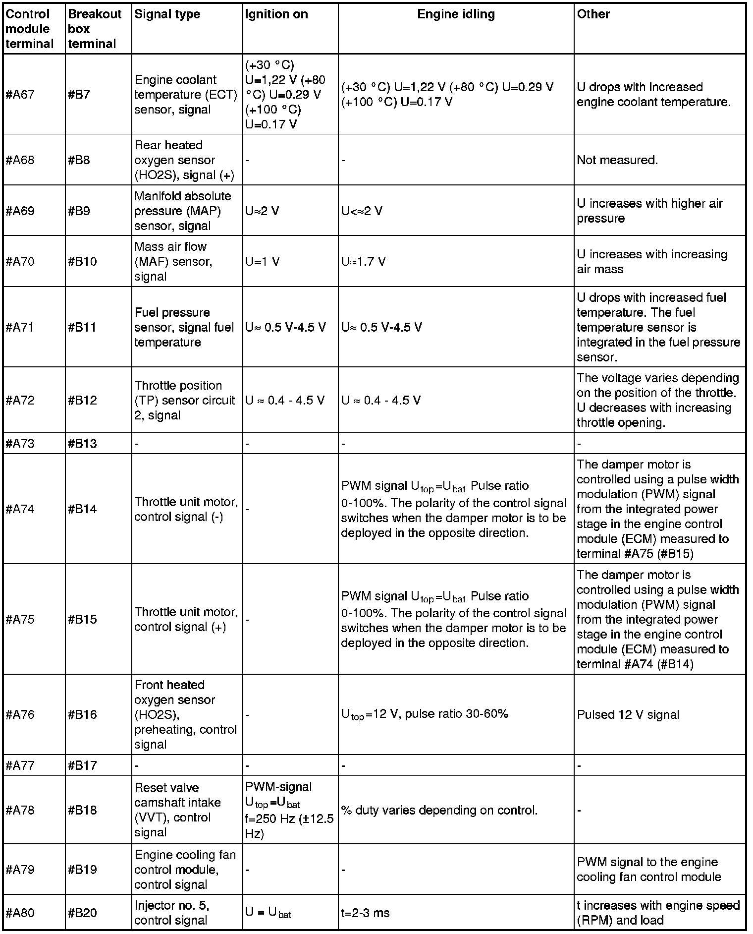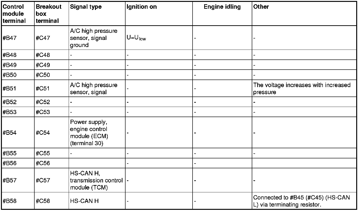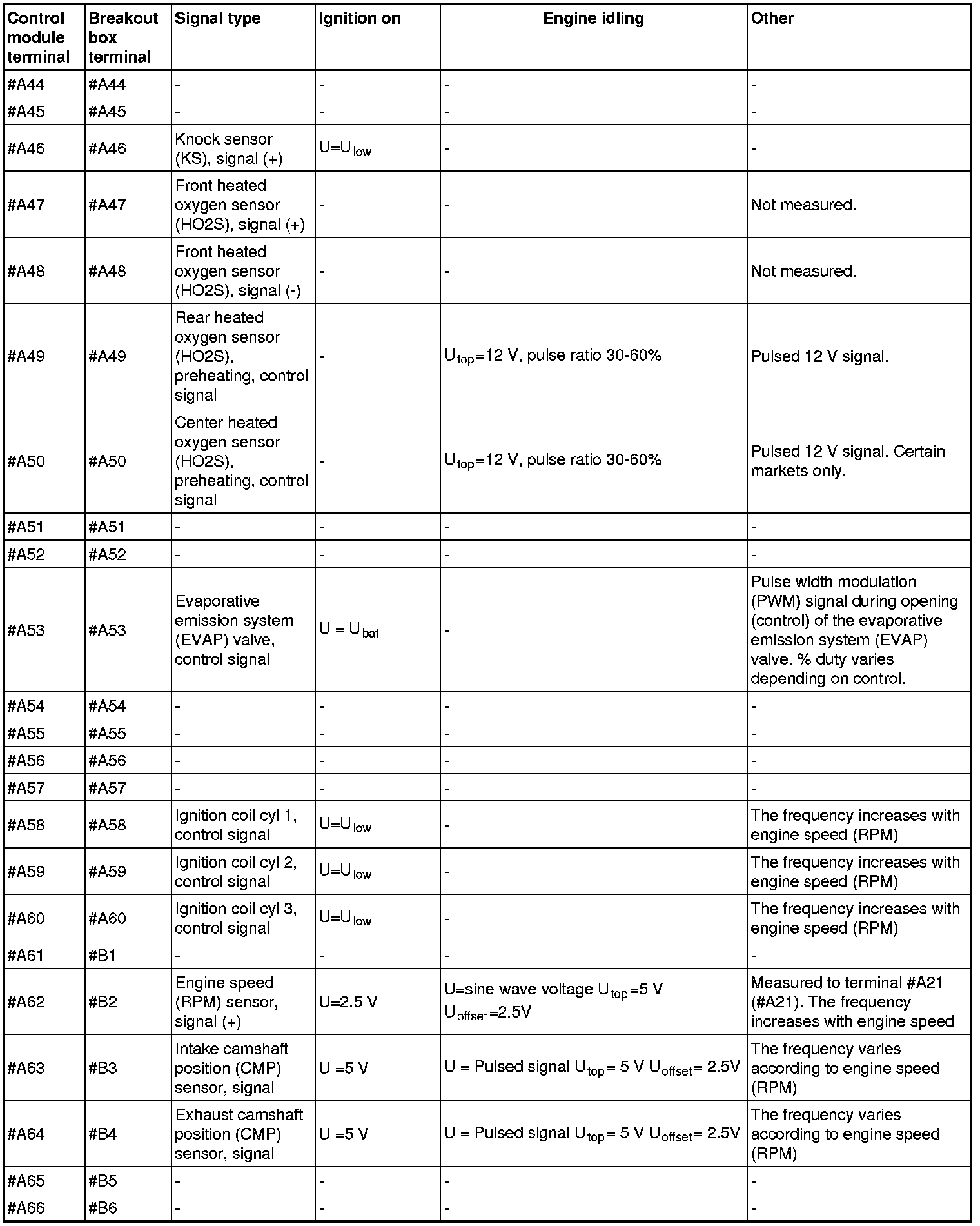 All values given below are between the terminals stated in column 1 and breakout box terminal in the terminal) and terminal #B1 (#C1) unless otherwise indicated in column 6 (Miscellaneous).