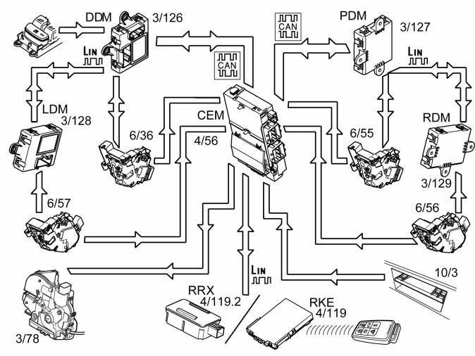 Note! The market in Japan has Remote Keyless Entry (RKE) regardless of if the vehicle is equipped with keyless entry system or not. When the vehicle is not equipped with keyless entry system, the Remote Keyless Entry (RKE) communicates directly with Central electronic module (CEM).