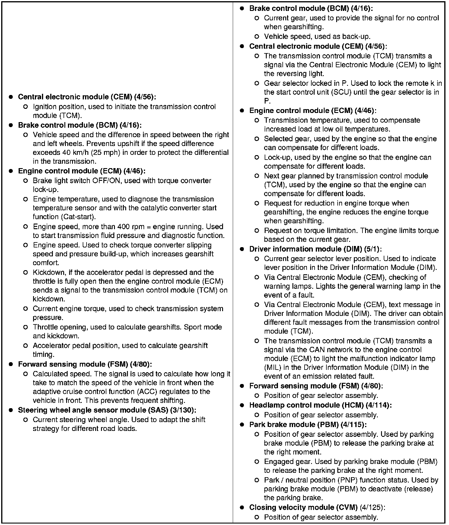 The transmission control module (TCM) receives information on required gear position and required driving style (driving program) from the driver. Together with signals from a number of sensors in the transmission and the engine management system, this enables the calculation of optimum gearshift timing and lock-up engagement, in contrast to a gearbox with only a hydraulic control system. The control module takes consideration of small changes in operating conditions and adapts the different transmission functions so that the correct gear is always selected in accordance with the driving program selected by the driver.