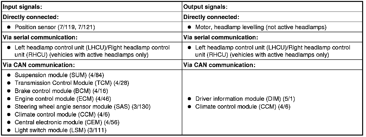 The table below summarizes the input signals to and output signals from the headlamp control module (HCM). The signal types are divided into directly connected signals, serial communication and CAN communication. The illustration below displays the same information with the Volvo component designations.
