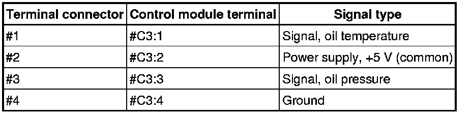 Oil temperature sensor: The resistance between terminal #1 and #4 must be 5.7 k ohms at +20 °C. the resistance drops with ascending temperature.