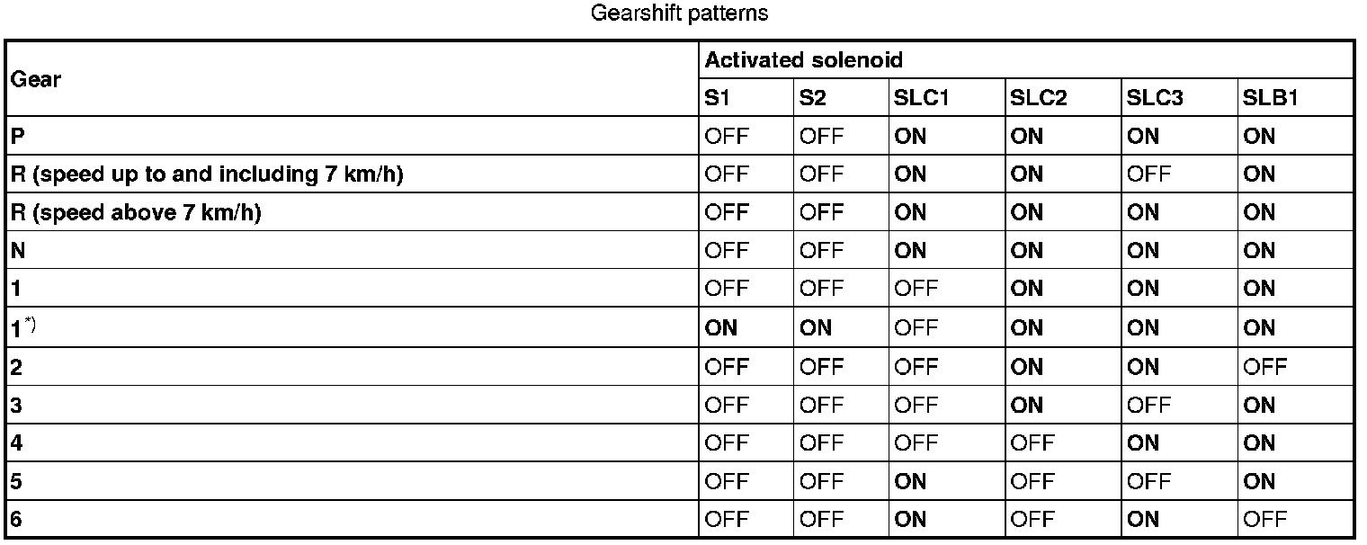 Gearshifts are regulated by means of the Transmission Control Module (TCM) activating the solenoids in specific patterns. The solenoids S1, S2, SLC1, SLC2, SLC3 and SLB1 control which gear shall be engaged. The solenoids SLC1, SLC2, SLC3 together with solenoid SLT also control how the engagement shall take place by means of adapting the hydraulic pressure. The basic parameters for the differences in gearshift timing are the position of the accelerator pedal and vehicle speed, while the gearshift quality is determined by the torque steer.