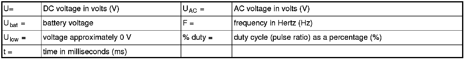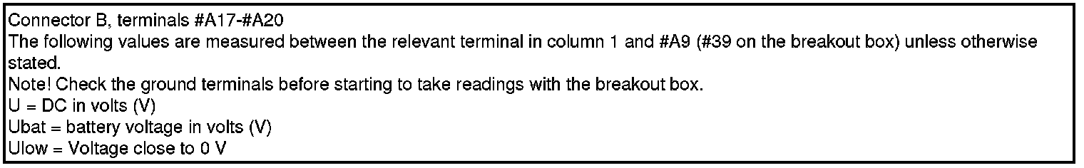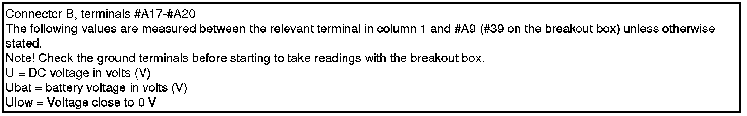 All values listed below are between the terminal in column 1 and terminal #A9 (#39 on the breakout box), unless otherwise indicated in brackets.