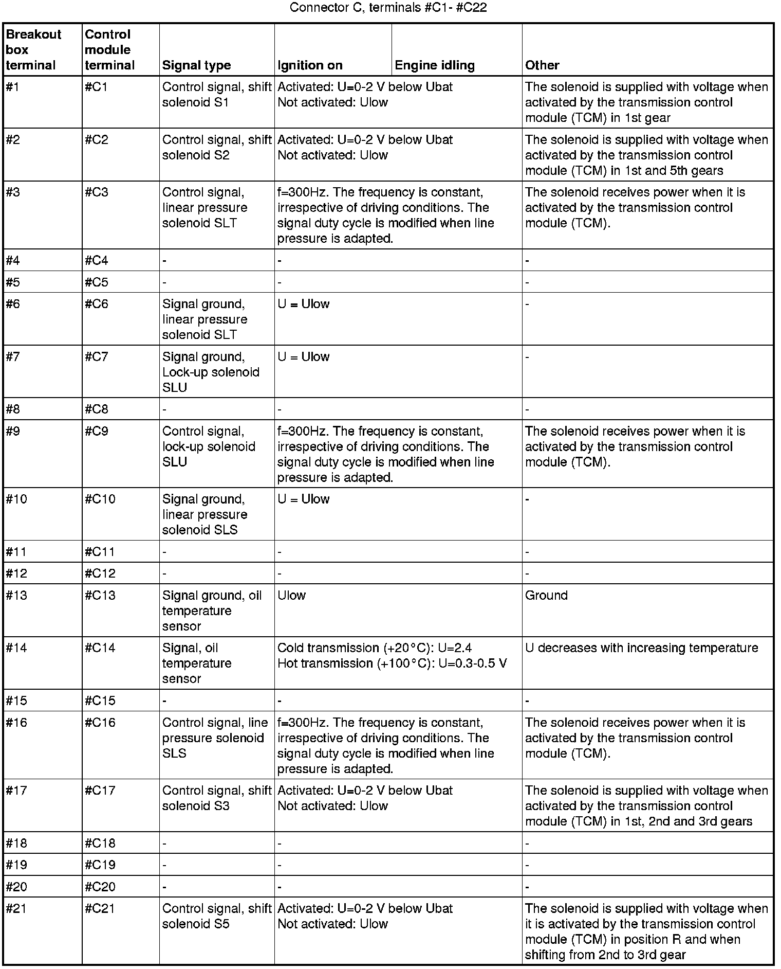 - Connector C (22-pin on transmission side) corresponds to terminals #1 - #22 on the breakout box.
