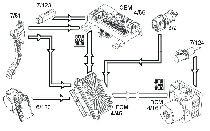- clutch pedal sensor (7/123) via central electronic module (CEM) (4/56)