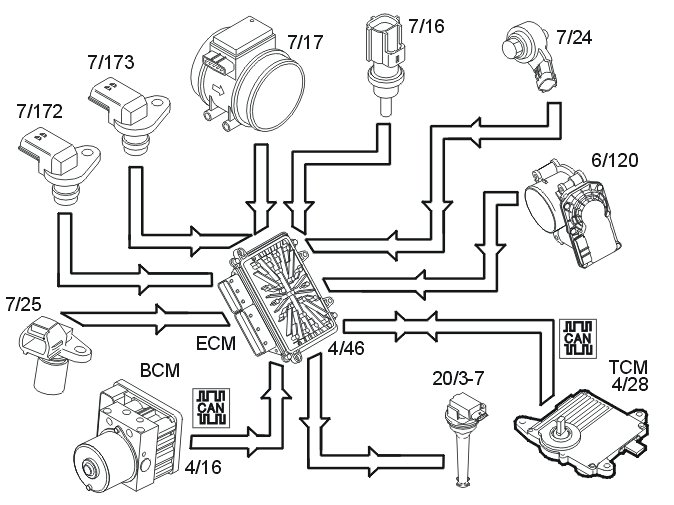 To ensure that the correct throttle angle is reached, the engine control module (ECM) controls the throttle shutter in the throttle unit (6/120), mainly using the signal from: