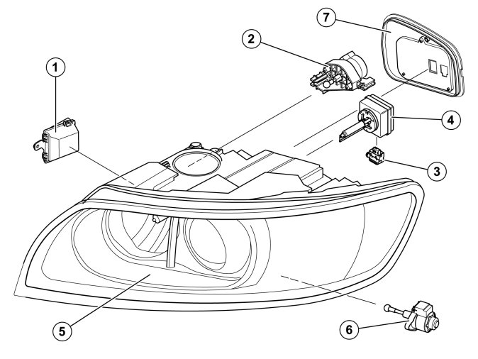 The lamp housing contains a sensor that indicates whether the light beam has been turned out to the right or left. The left headlight control unit (LHCU) and right headlight control unit (RHCU) send this information to the headlight control module (HCM).