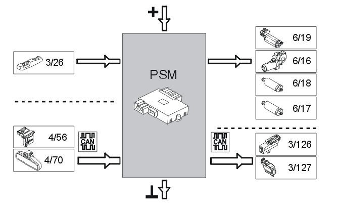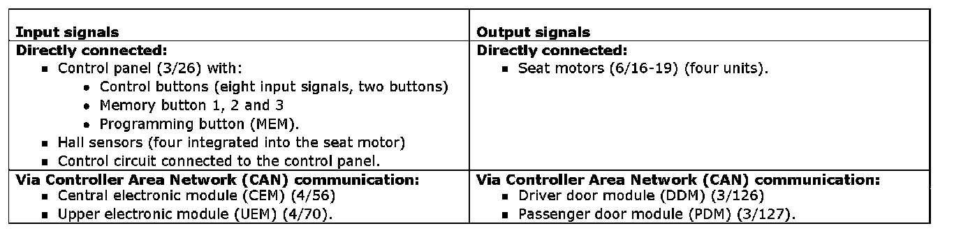 The table below summarizes input and output signals to and from the power seat module (PSM) (4/52). The signal types are divided into directly connected signals, serial communication and controller area network (CAN) communication. The illustration below displays the same information with the Volvo component designations.