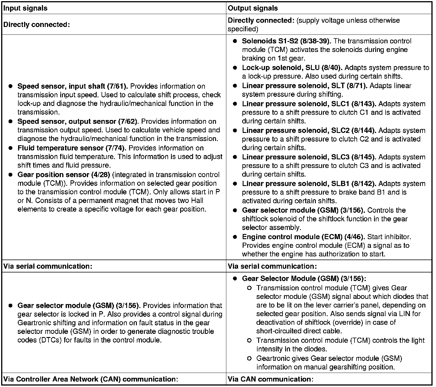 The table below summarizes the input and output signals to and from the transmission control module (TCM). The signal types are divided into directly connected signals, serial communication and CAN communication. The illustration below displays the same information with Volvo component designations.