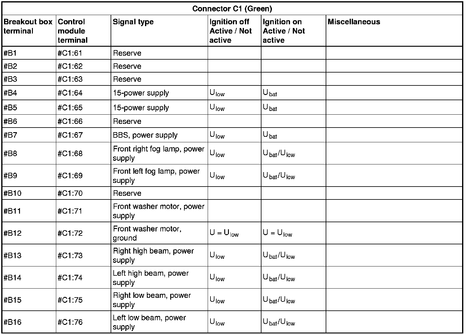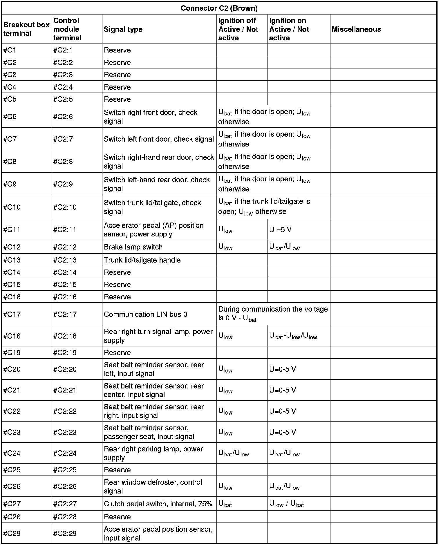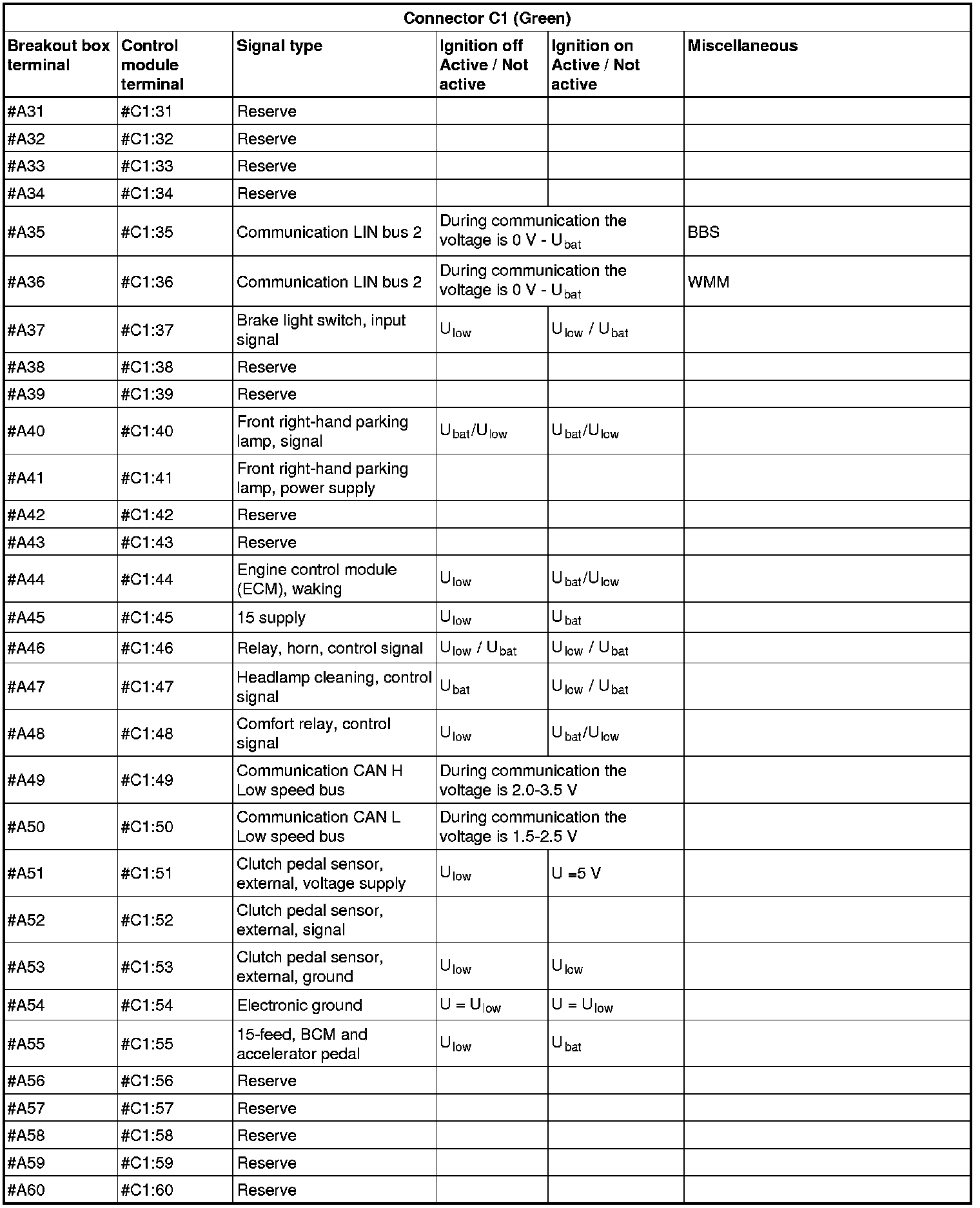 All values given below are between the terminals stated in column 1 and terminal #D5 (power ground). This applies unless otherwise indicated in the last column.