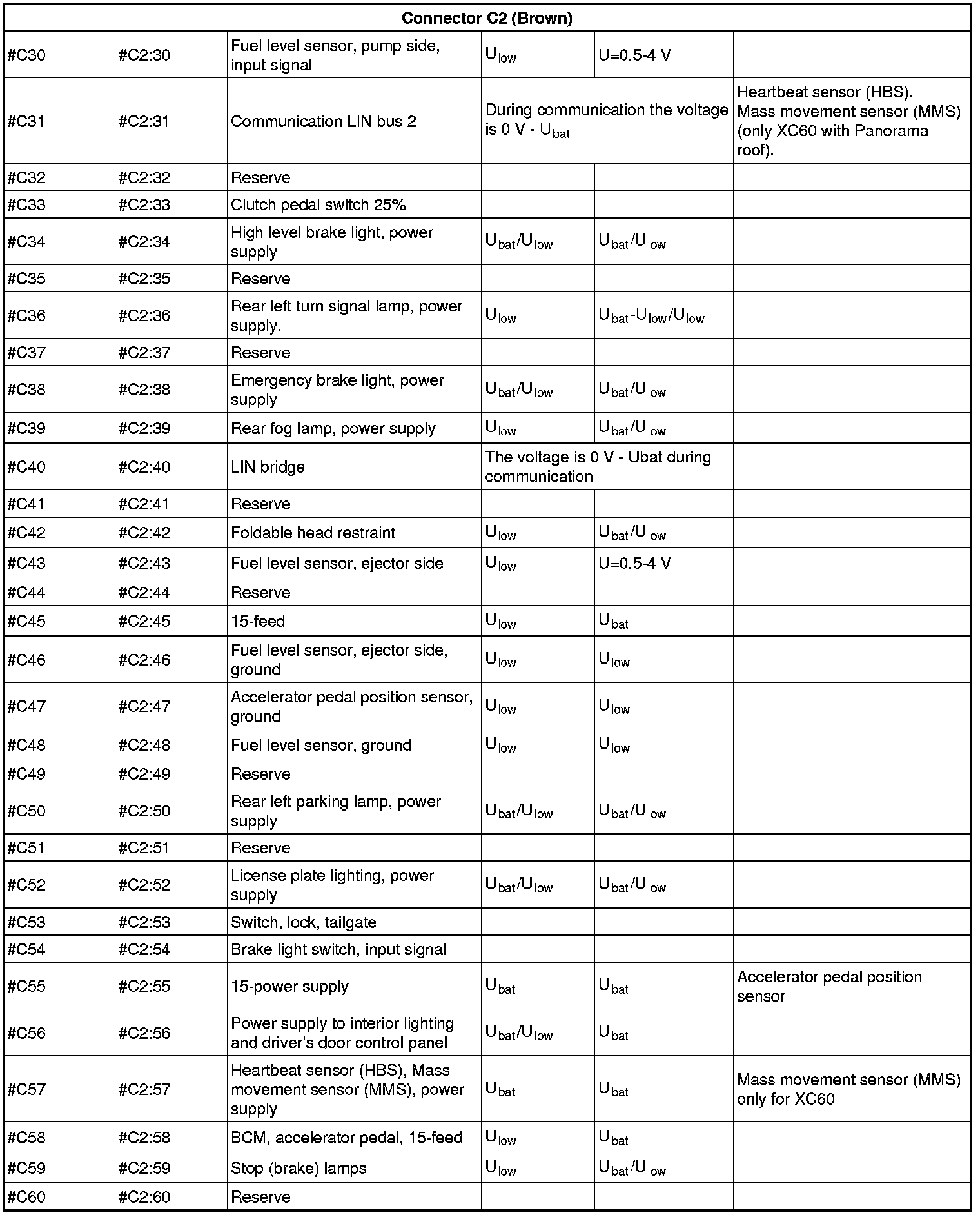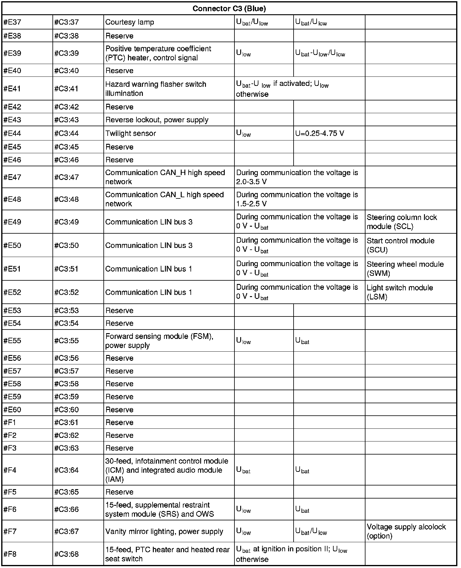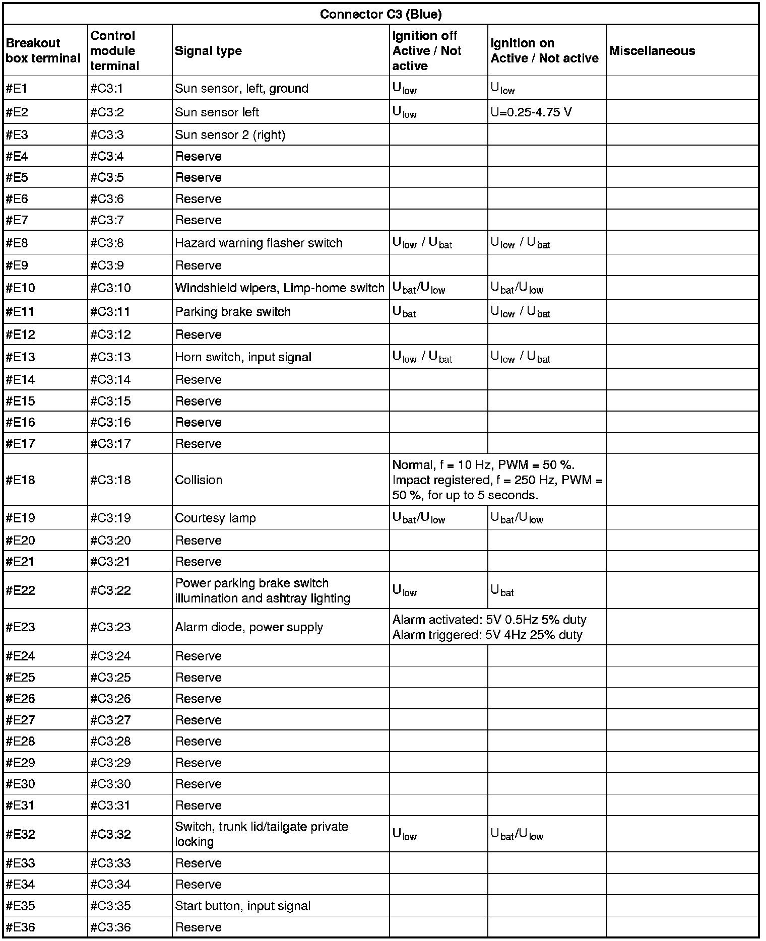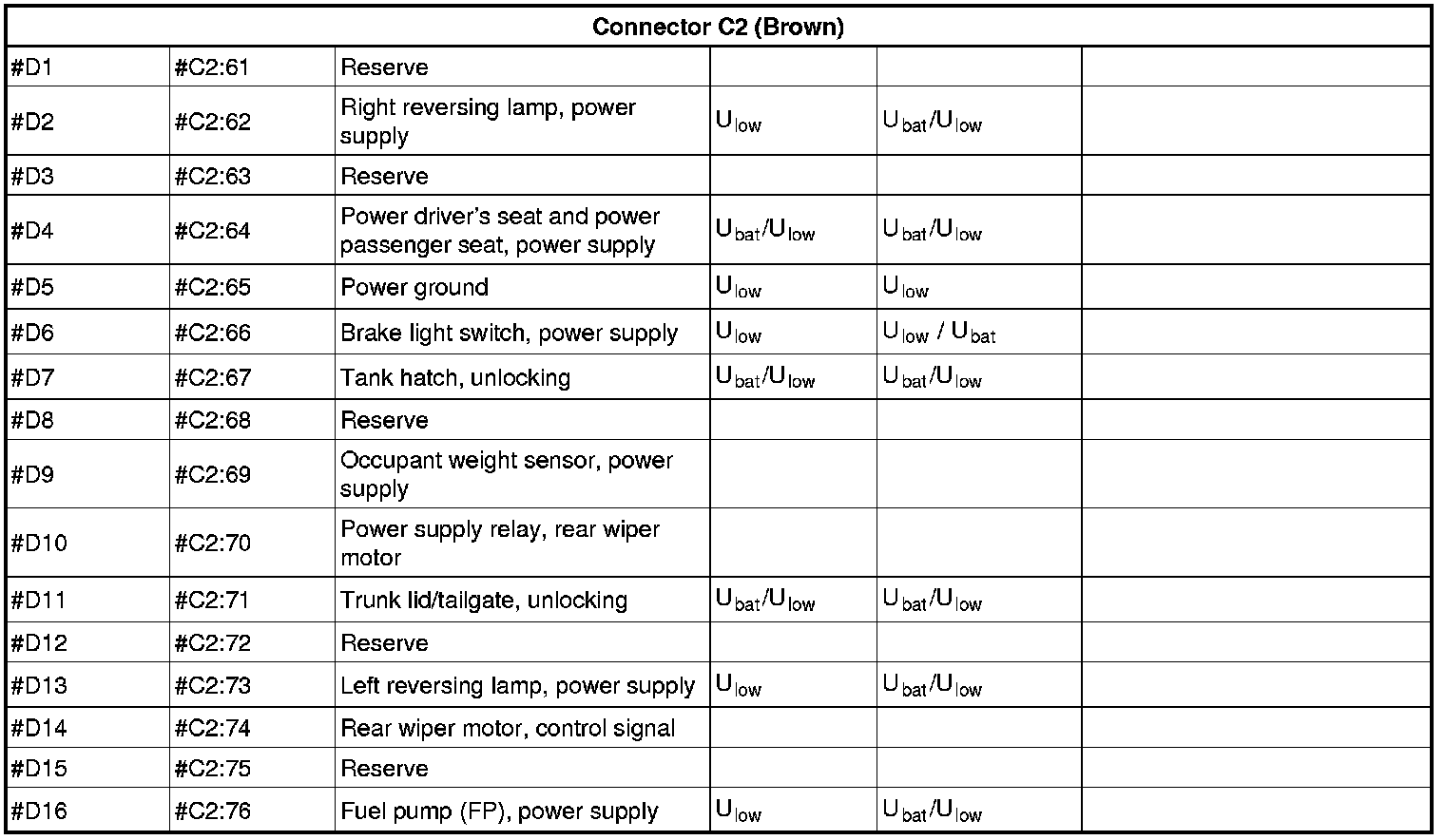 All values given below are between the terminals stated in column 1 and terminal #D5 (power ground). This applies unless otherwise indicated in the last column.
