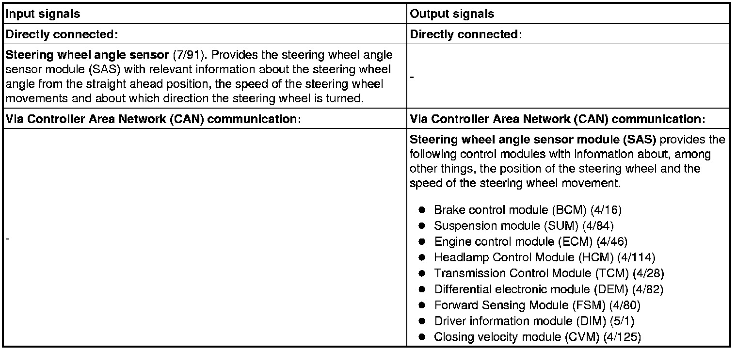 The table below summarizes input and output signals to and from the steering wheel angle sensor module (SAS). The signal types are divided into directly connected signals, and CAN communication.