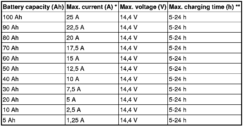 * Max. current is calculated with the following formula (Battery capacity Ah/20)*5. For example, for a battery with capacity 70 Ah: (70/20)*5= 17.5 A.