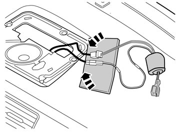 - Insert the long cable with the green connector from the TMC unit up between the air vent and through the hole in the loudspeaker grill, the same way as the previously routed cable.