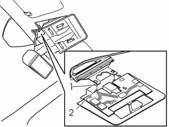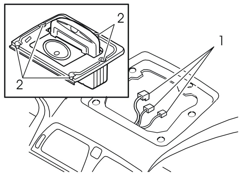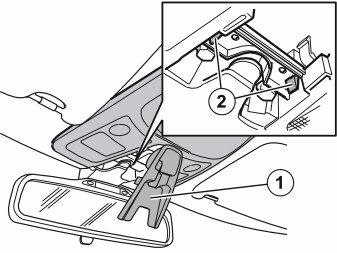 - Install the new antenna. Carefully bend the headlining downward and slide the antenna backward and inwards. Align the antenna lugs (1) with the grooves in the bracket (2)