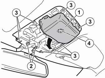 - Detach the rear-view mirror and front interior lighting (1) by first removing the two screws (2) and then pressing in the eight catches (3) around the interior lighting.
