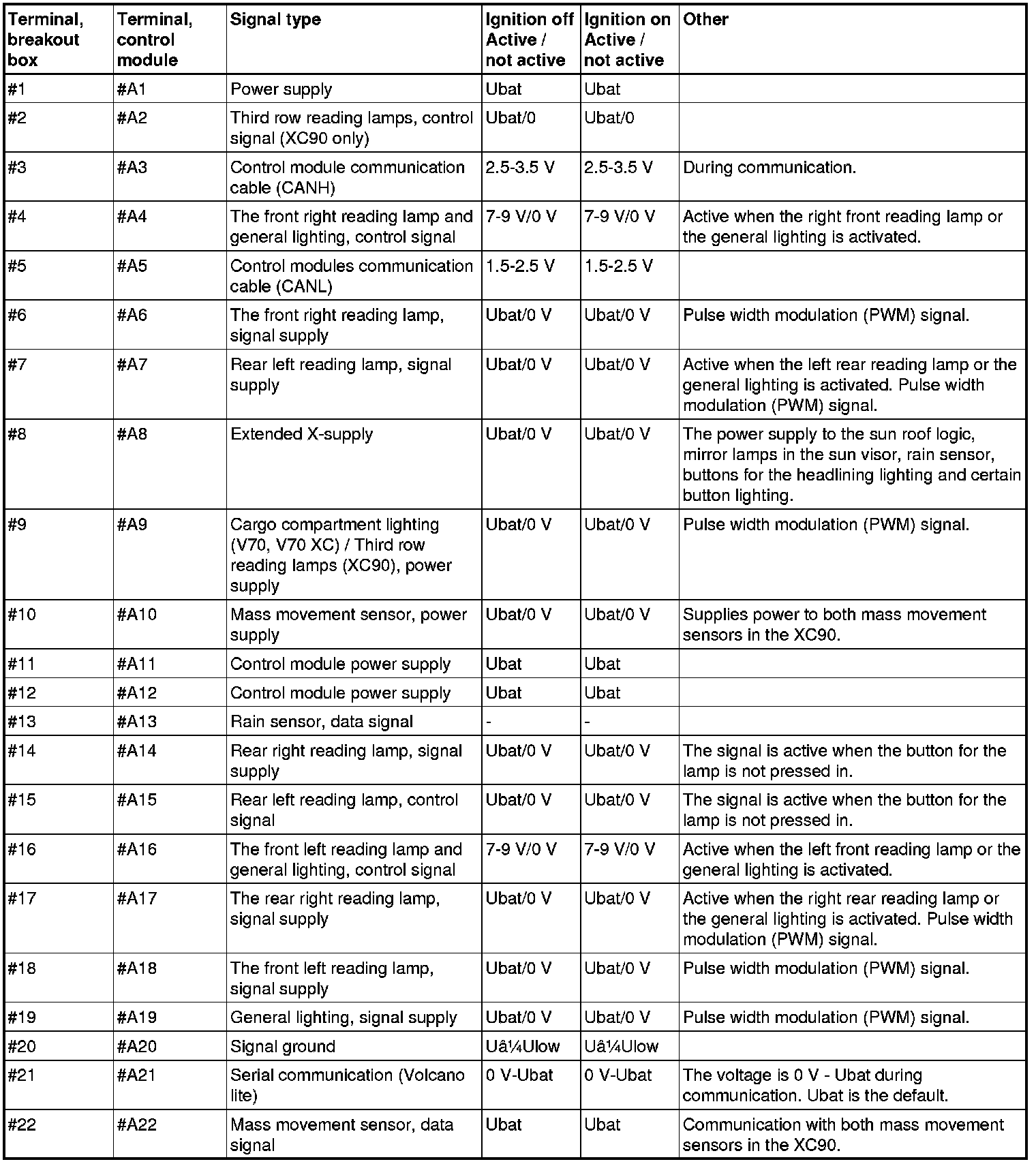 The following values are measured between the relevant terminal in column 1 and terminal #A20 (signal ground) unless otherwise stated.