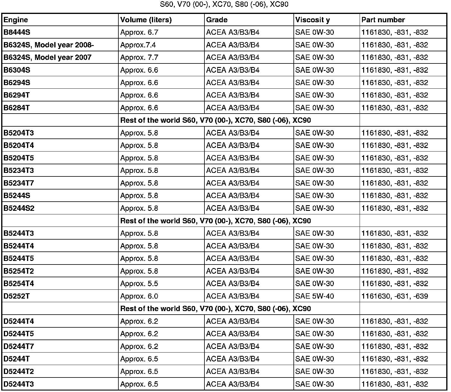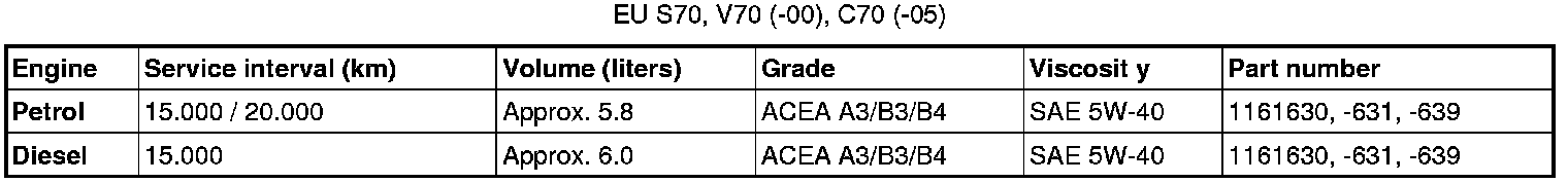 Oil grade ACEA A3/B3/B4 can not be replaced by any other oil other than the one prescribed in the table for engines D5244T, D5244T2 and D5244T3.