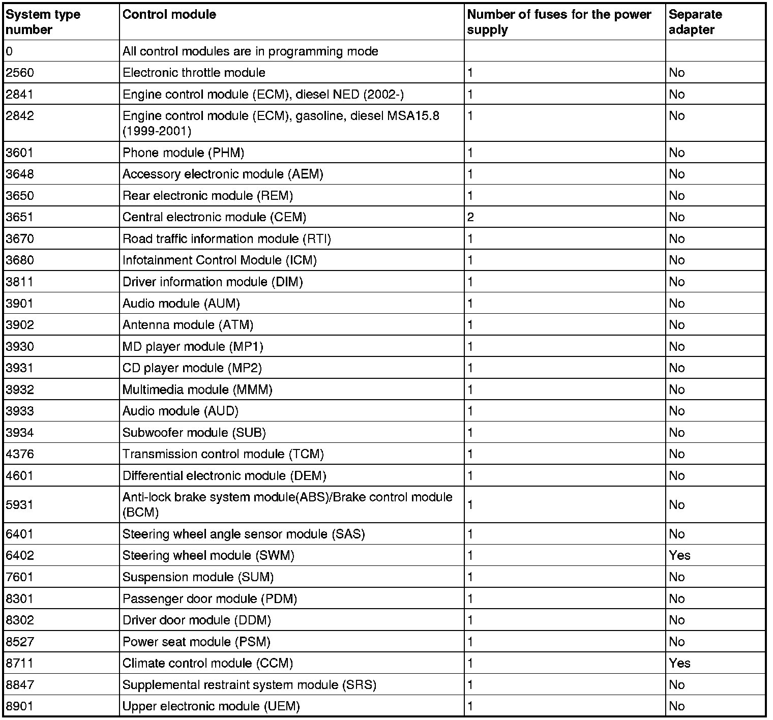 The table indicates which system type number the control modules have.