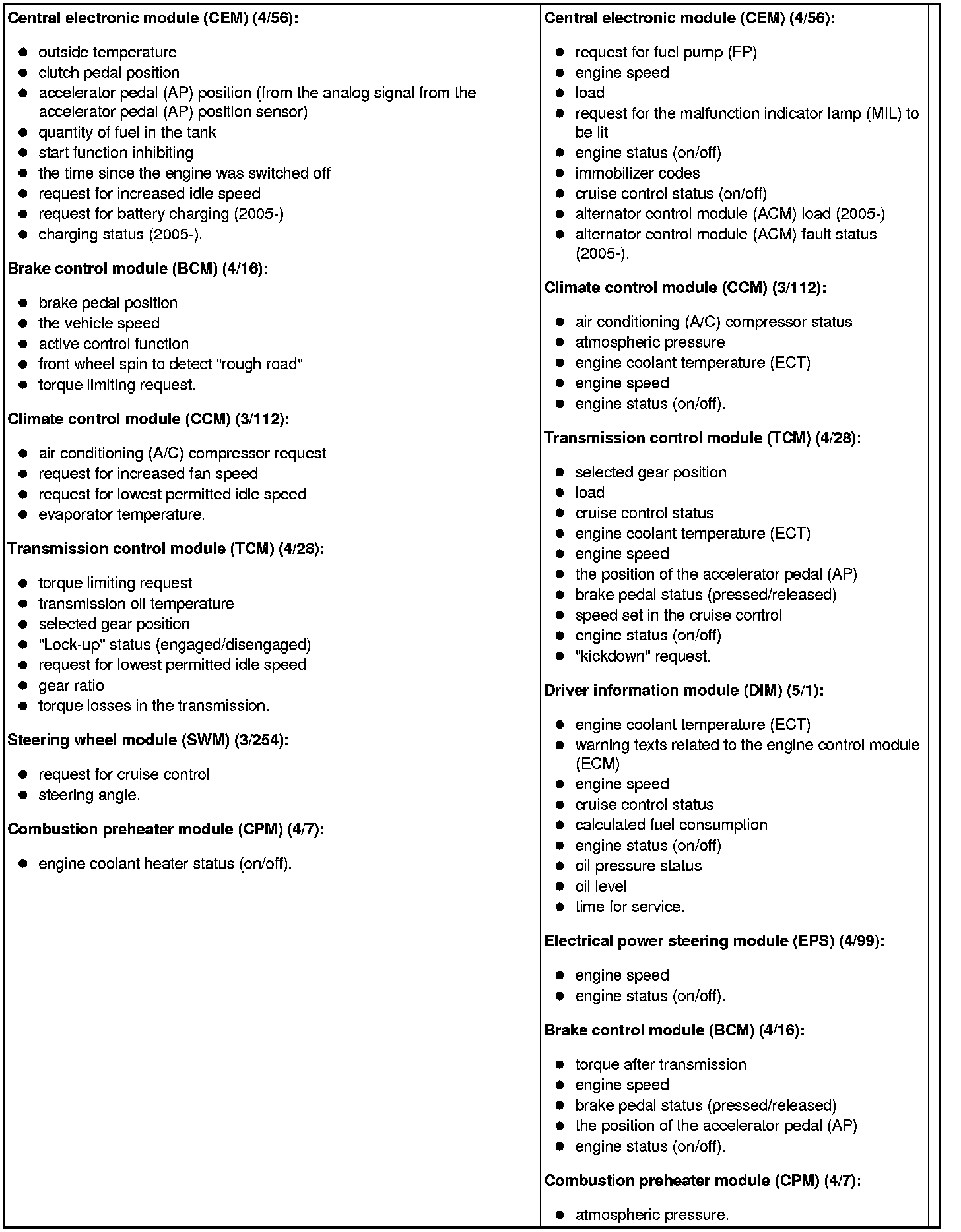 The table below summarizes the input signals to and output signals from the Engine Control Module (ECM). The signal types are divided into directly connected signals, serial communication and controller area network (CAN) communication. The illustration below displays the same information with the Volvo component designations.