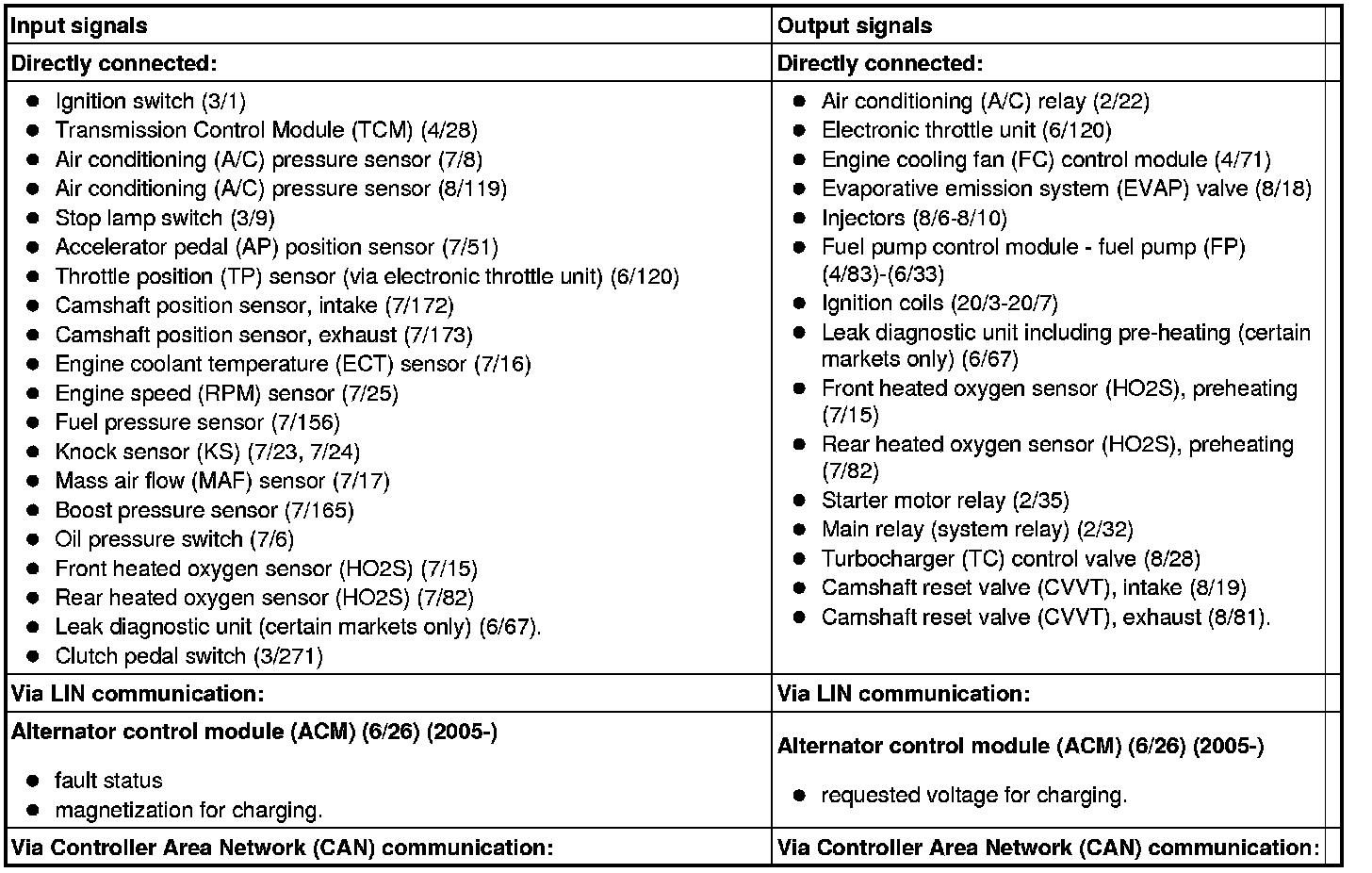The table below summarizes the input signals to and output signals from the Engine Control Module (ECM). The signal types are divided into directly connected signals, serial communication and controller area network (CAN) communication. The illustration below displays the same information with the Volvo component designations.