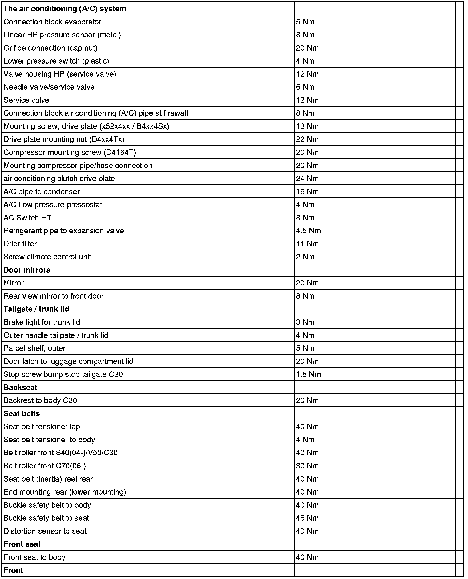 Summary of tightening torques for specific components