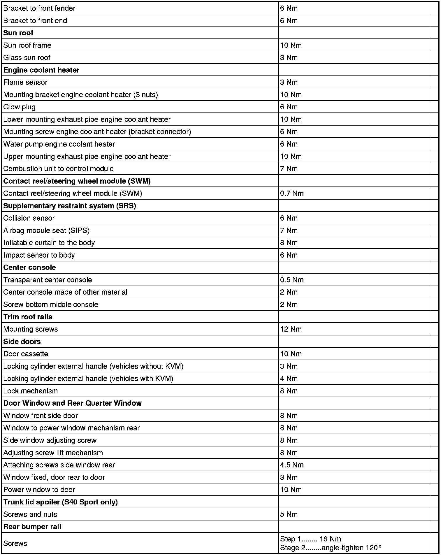 See the table below to find the tightening torques for components not included in the summary.