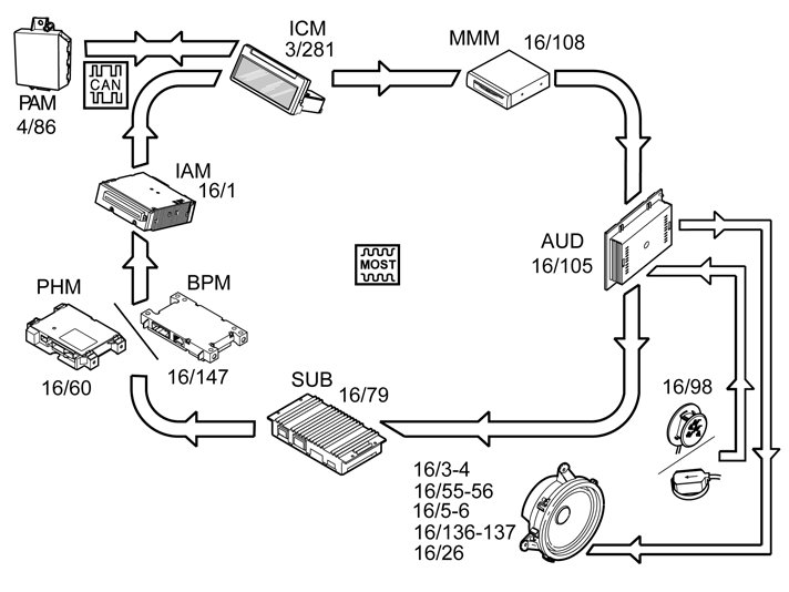 When sound compensation is required, the infotainment control module (ICM) transmits sound compensation signals via the MOST network to the audio module (AUD).