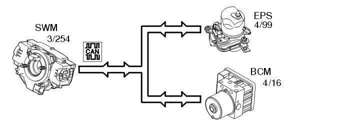 The steering wheel angle sensor (7/91) is integrated in the Steering wheel module (SWM) (3/254) and registers information about the steering wheel's angle and the number of steering wheel turns that have been made. The Steering wheel module (SWM) then transmits the information via the CAN network to the Brake control module (BCM) (4/16) (only vehicles with DSTC) and the Electrical power steering module (EPS) (4/99).